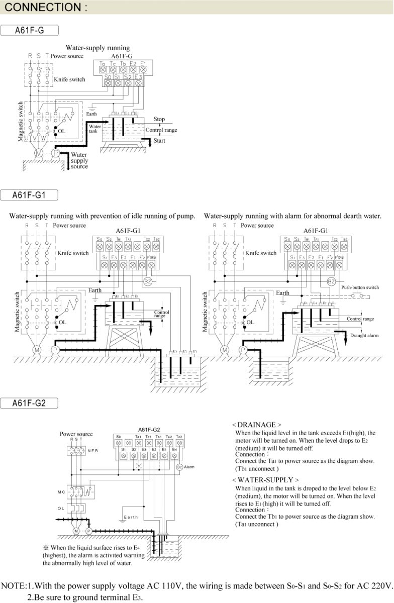Prev Next Level Switch Level Switch A61F-G FLOATLESS RELAY Add to inquiry Inquiry list Description Wiring and timing diagrams Overall dimensions or other Download Suitable for any electrolytic fluid surface (NO VOLATILE FLUID) AC operating voltage Protection against interference from power surge Low electrodes AC voltage to prevent electrolysis for longer life expectance Low electrodes AC voltage to prevent electrolysis for longer life expectance Automatic water supply or drainage operation and alarm for anomaly water supply* Note: "*" indicates applicable to A61F-G2 series only AFS/AFR/A61F-G Catalogue