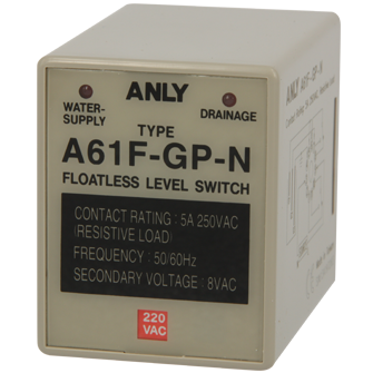 Prev Next Level Switch Level Switch A61F-GP-N FLOATLESS RELAY Add to inquiry Inquiry list Description Wiring and timing diagrams Overall dimensions or other Download Suitable for any electrolytic fluid surface (NO VOLATILE FLUID) AC operating voltage Protection against interference from power surge Low electrodes AC voltage to prevent electrolysis for longer life expectance Low electrodes AC voltage to prevent electrolysis for longer life expectance AFS/AFR/A61F-G Catalogue
