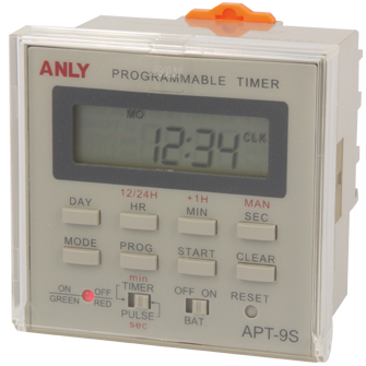 Prev Timer Programmable Timer APT-9S WEEKLY PROGRAMMABLE TIMER Add to inquiry Inquiry list Description Wiring and timing diagrams Overall dimensions or other Download Weekly programmable timer 80 different timing settings per day Different weekday combinations assignment for each task Built-in Lithium battery prevent power outage up to one year Crystal oscillator for extreme accuracy EEPROM program memory for battery independence Separate twin timer feature for ON-time or ON-time-OFF-time countdown Daylight-saving-time function Backlit LCD for easy viewing UL, C-UL recognized and CE certified APT-9S Catalogue APT-8S/APT-9S Users Manual