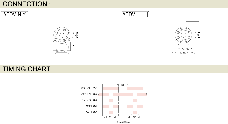 Prev Timer Analogue Timer ATDV TWIN ANALOGUE TIMER Add to inquiry Inquiry list Description Wiring and timing diagrams Overall dimensions or other Download Customized CMOS IC for low power consumption, high operation stability and extreme timing accuracy Independent adjustment for continuous ON-OFF operation and time 16 different time ranges available 2 operating voltage in a single unit, AC110V and 220V 5(A, B, C, D, E) timing series available* Each timing series has 4 time ranges, selectable via DIP switch* CE certified Note: "*" indicates applicable to ATDV multi range series only ATDV Catalogue