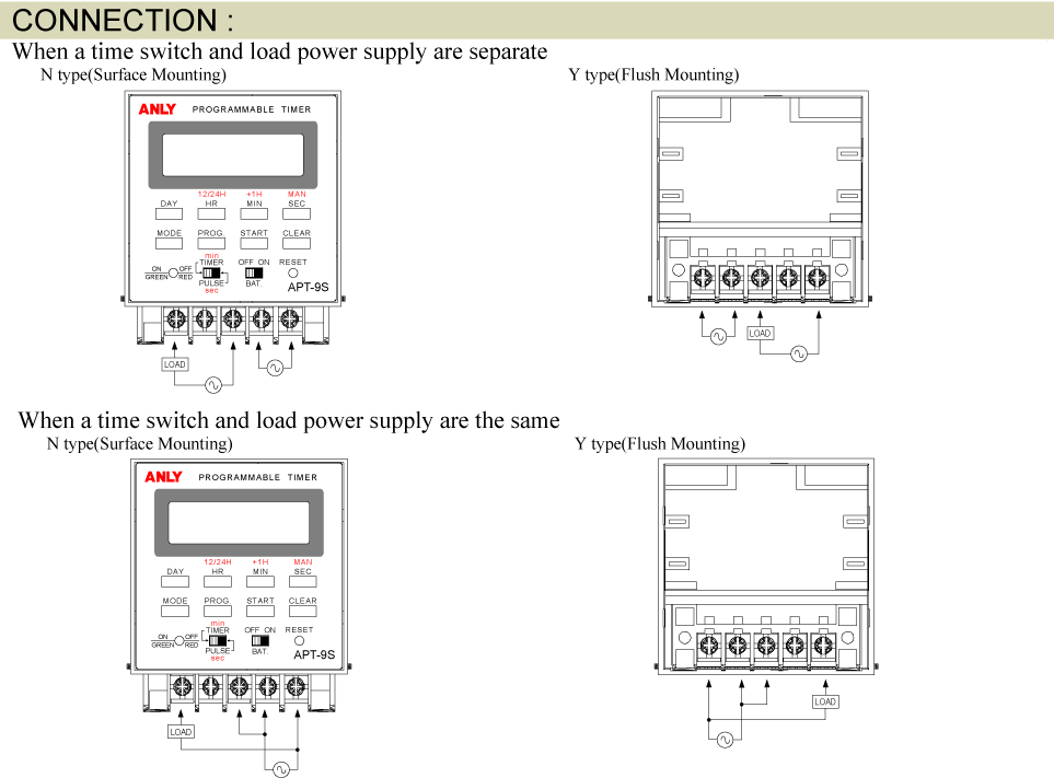 Prev Timer Programmable Timer APT-9S WEEKLY PROGRAMMABLE TIMER Add to inquiry Inquiry list Description Wiring and timing diagrams Overall dimensions or other Download Weekly programmable timer 80 different timing settings per day Different weekday combinations assignment for each task Built-in Lithium battery prevent power outage up to one year Crystal oscillator for extreme accuracy EEPROM program memory for battery independence Separate twin timer feature for ON-time or ON-time-OFF-time countdown Daylight-saving-time function Backlit LCD for easy viewing UL, C-UL recognized and CE certified APT-9S Catalogue APT-8S/APT-9S Users Manual