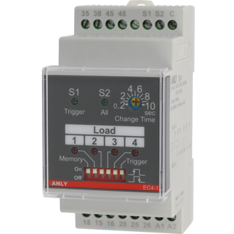 Next Control Relay Exchange Relay EC4-1 EXCHANGE RELAY Add to inquiry Inquiry list Description Wiring and timing diagrams Overall dimensions or other Download Switching Mode Power Supply for 100~240V AC/DC operation Up to 4 loads can be individually selected via DIP switch Up to 11 load combinations are possible (Please see the table below) Load 1 & 2 are C/O contacts; Load 3 & 4 are N.O. contacts Change Time between loads can be adjusted from 0.2 to 10 sec S1, Load exchange signal can be rising-edge or falling edge S2, All-On signal can force all selected loads to start sequentially Load Memory can let users chose to either resume the running load or to always start from Load 1 after a power reset A power reset is required for setting changes to take effect EC4-1 Catalogue EC4-1 Users Manual