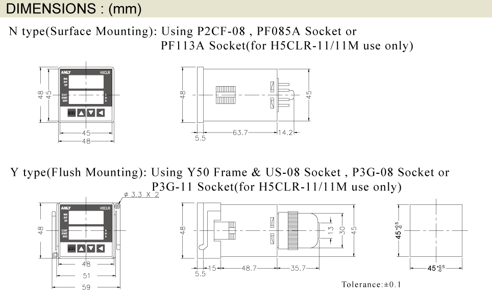 Prev Next Timer Digital Timer H5CLR MULTI-FUNCTION DIGITAL TIMER Add to inquiry Inquiry list Description Wiring and timing diagrams Overall dimensions or other Download Eleven field-selectable output modes accommodate a wide variety of applications 7-segment-display for clear display and effective monitoring All parameters set by scrollthrough menus accessed from the front panel Field-selectable time ranges from 0.001 second to 9999 hours Precision control possible to 0.001 second Four levels of key protection provided Count Up or Count Down mode user selectable Memory function available UL, C-UL recognized and CE certified H5CLR Catalogue H5CLR/ASY-4DR Users Manual