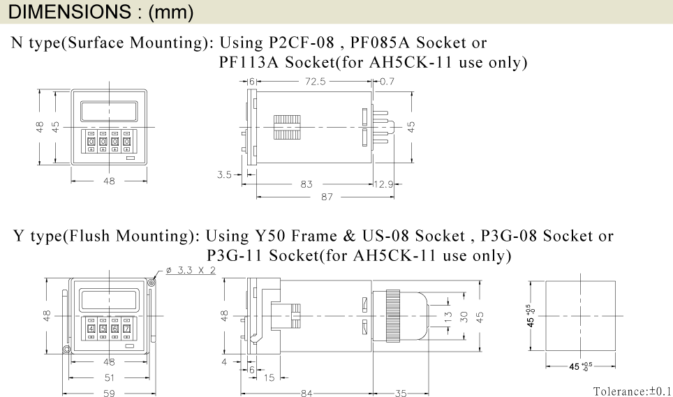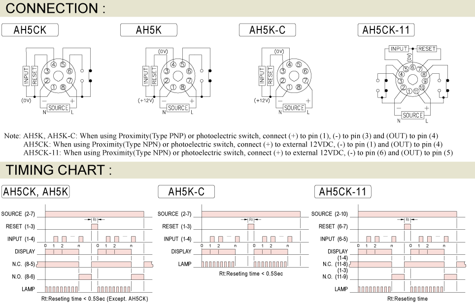 Prev Next Counter Counter AH5K PRESET COUNTER Add to inquiry Inquiry list Description Wiring and timing diagrams Overall dimensions or other Download Proximity and photoelectric switch compatible Seven-segment-display for clear display and effective monitoring Protection against power surge and high frequency interference Input signal - active-low or active-high input contact (1+4) Available on Count Up or Count Down model Reset method - shut-off reset or shorting contact (1+3) instantaneous reset Memory switch allows users to enable or disable permanent memory function * Manual reset button on faceplate * UL, C-UL recognized and CE certified * Note: *indicates applicable to AH5CK series only AH5CK/AH5K Catalogue